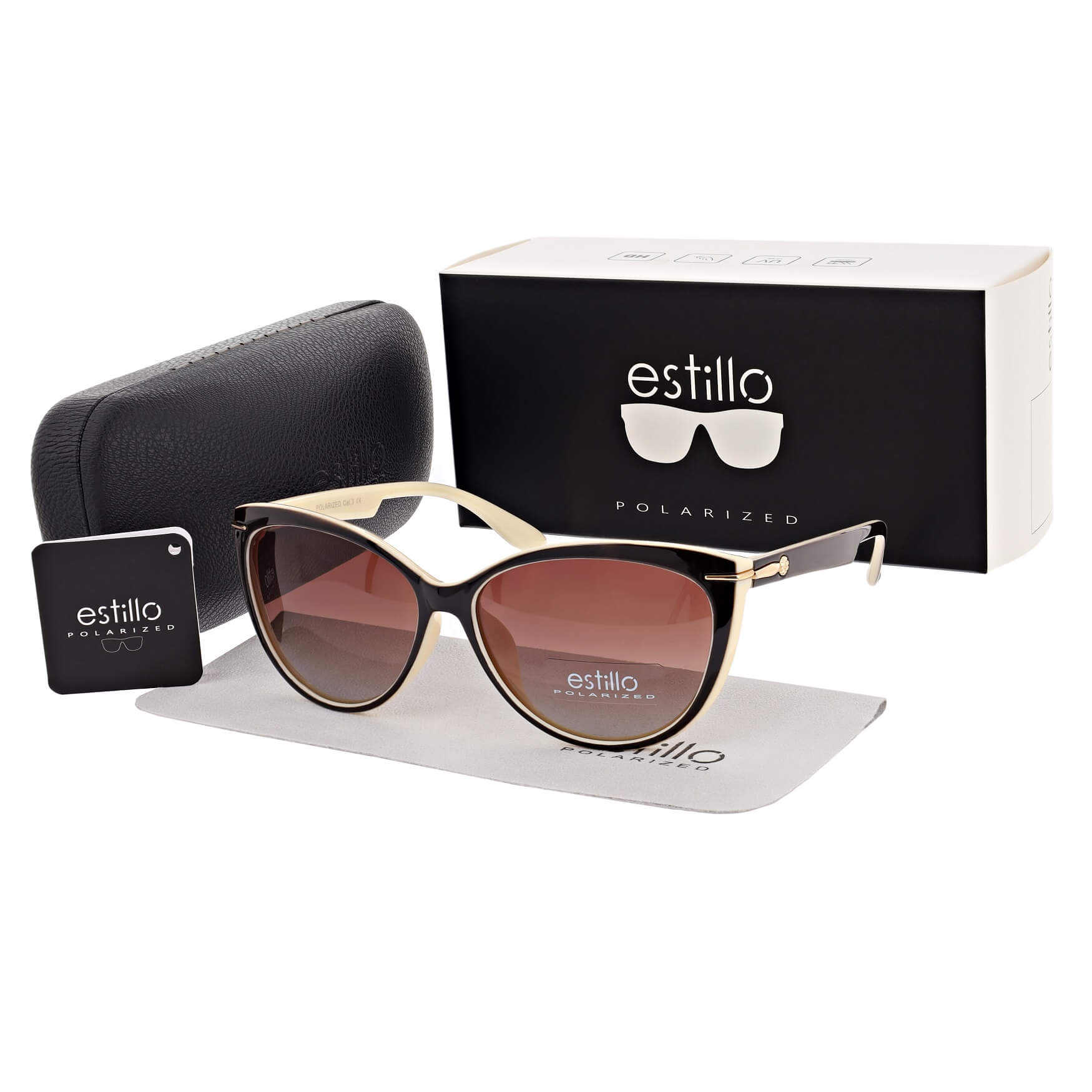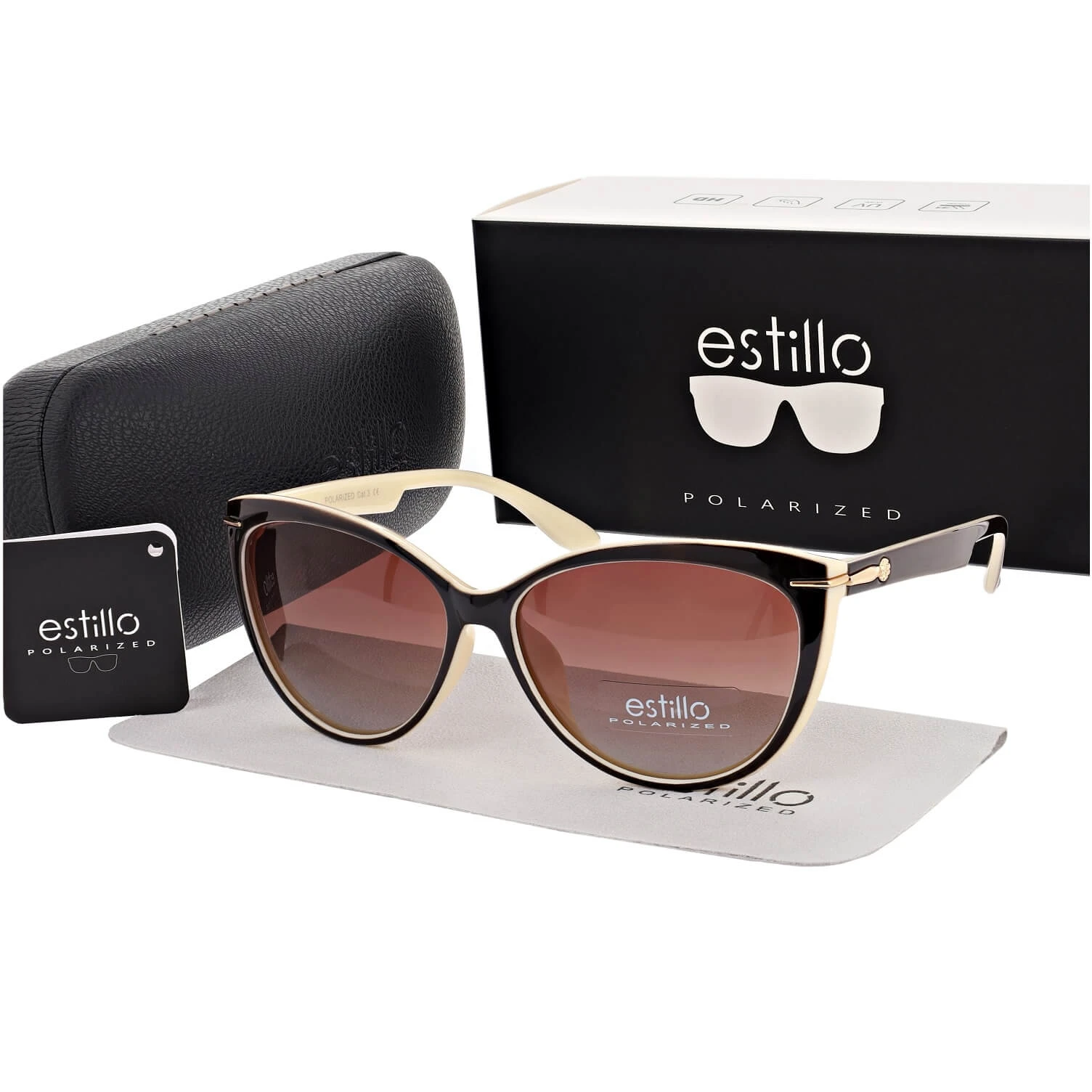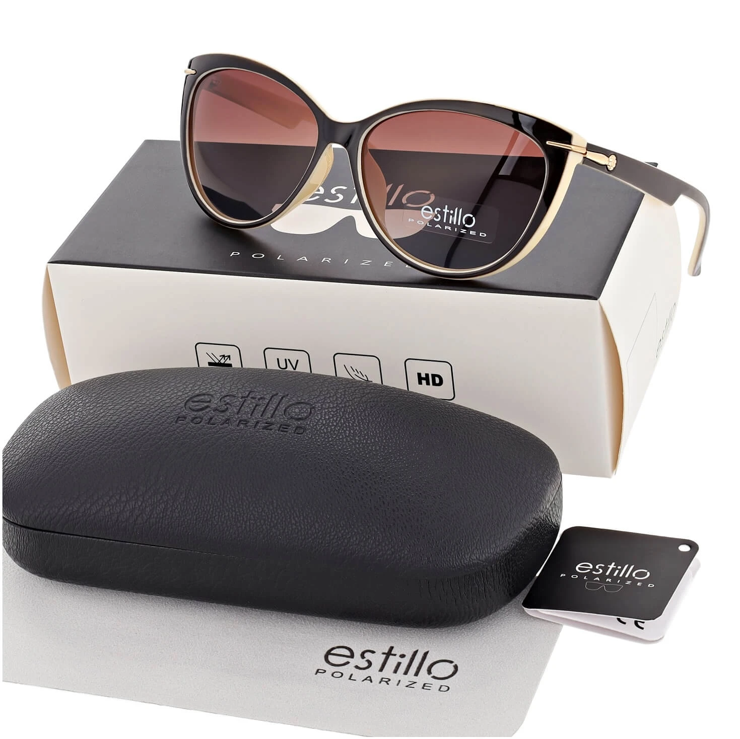 Okulary przeciwsłoneczne polaryzacyjne dla kobiet koloru kremowo-brązowego, kształtu kocie oczy w komplecie z zestawem markowych akcesoriów Estillo