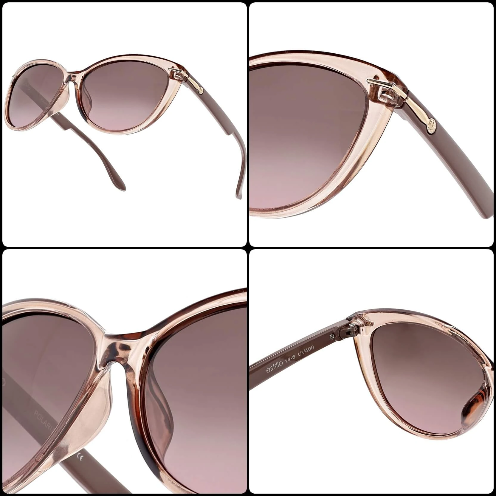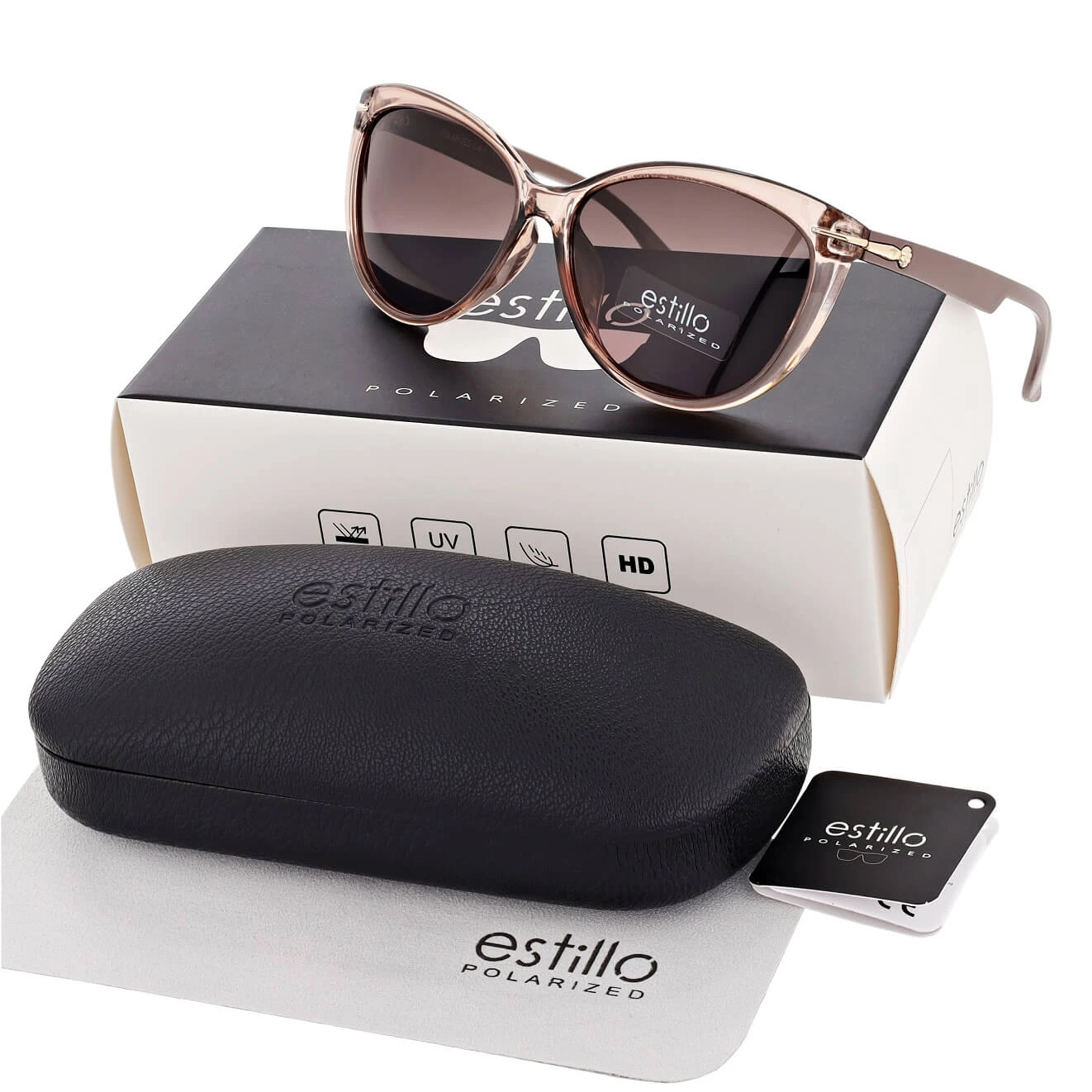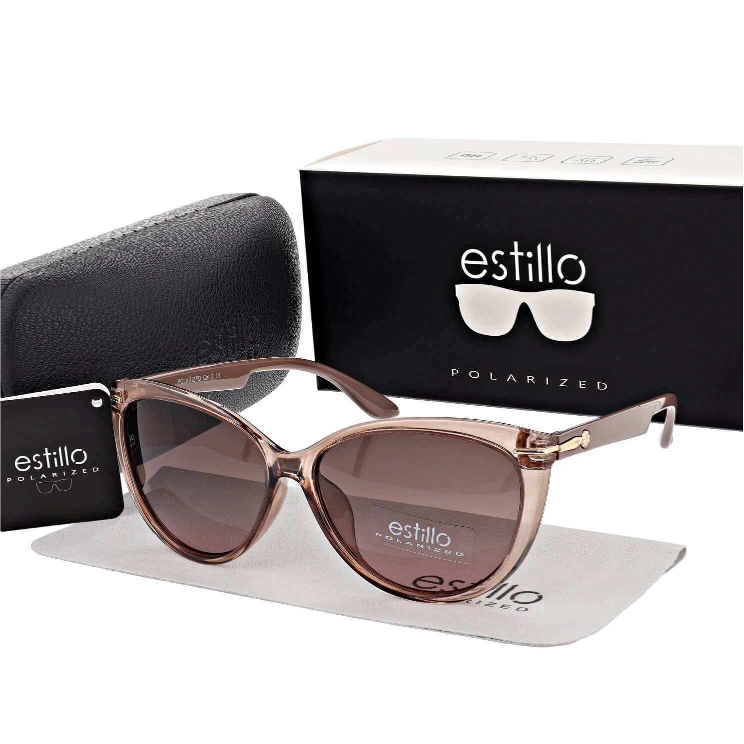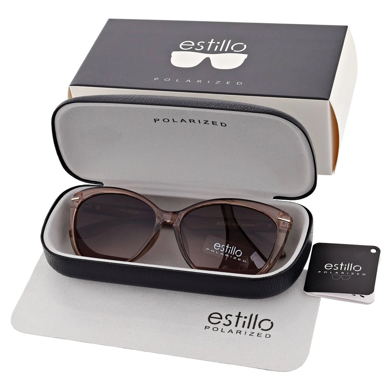 Okulary przeciwsłoneczne polaryzacyjne dla kobiet koloru kawowo-brązowego, kształtu kocie oczy w komplecie z zestawem markowych akcesoriów Estillo
